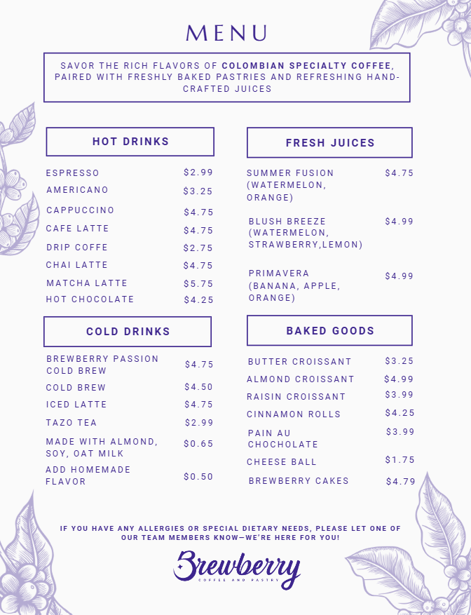 Coffee critics rave about the rich flavors of the Colombian coffee and the exceptional quality of the pastries. The friendly service adds warmth to your experience. Brewberry Cafe is truly a hidden gem worth visiting!